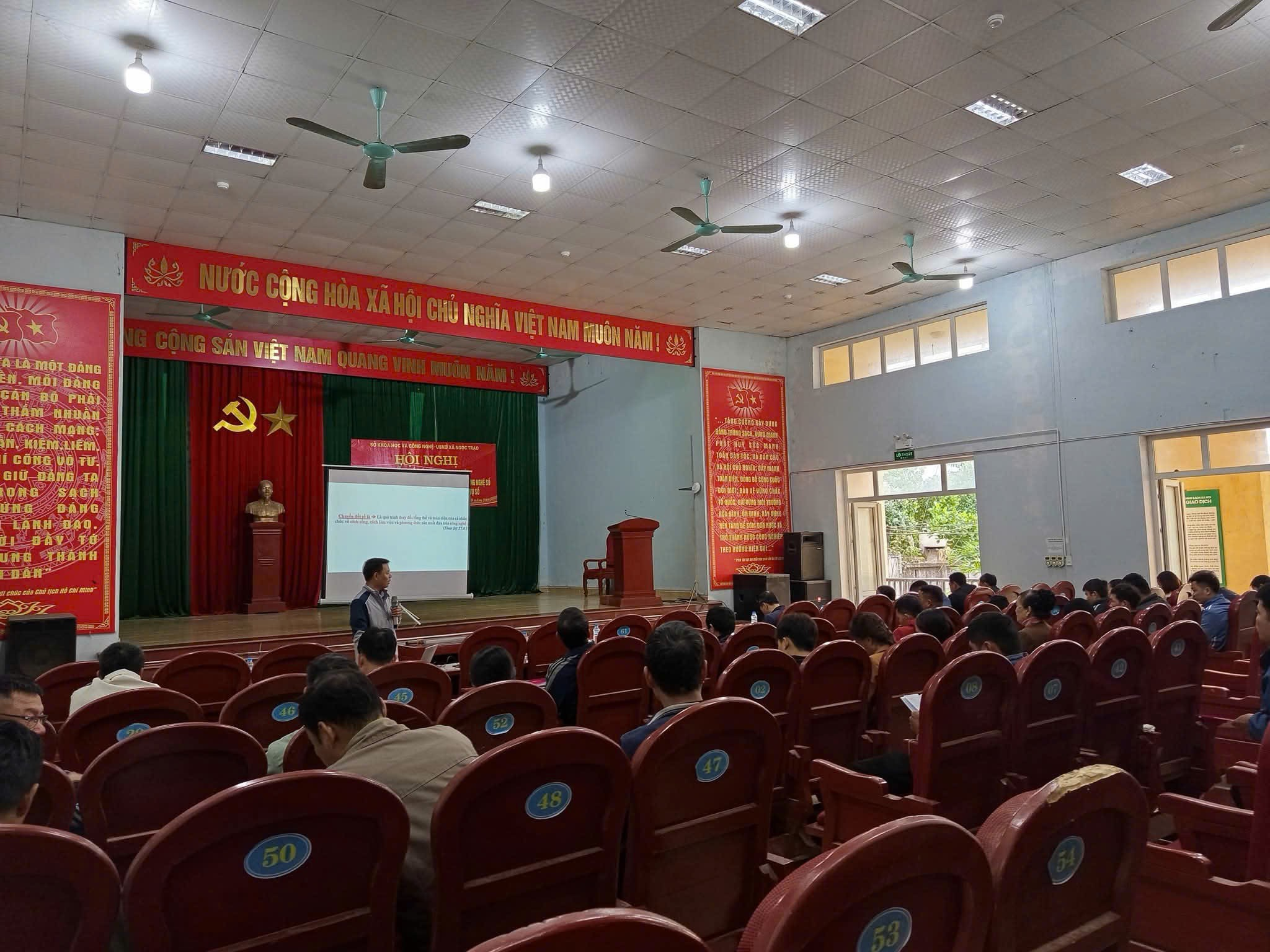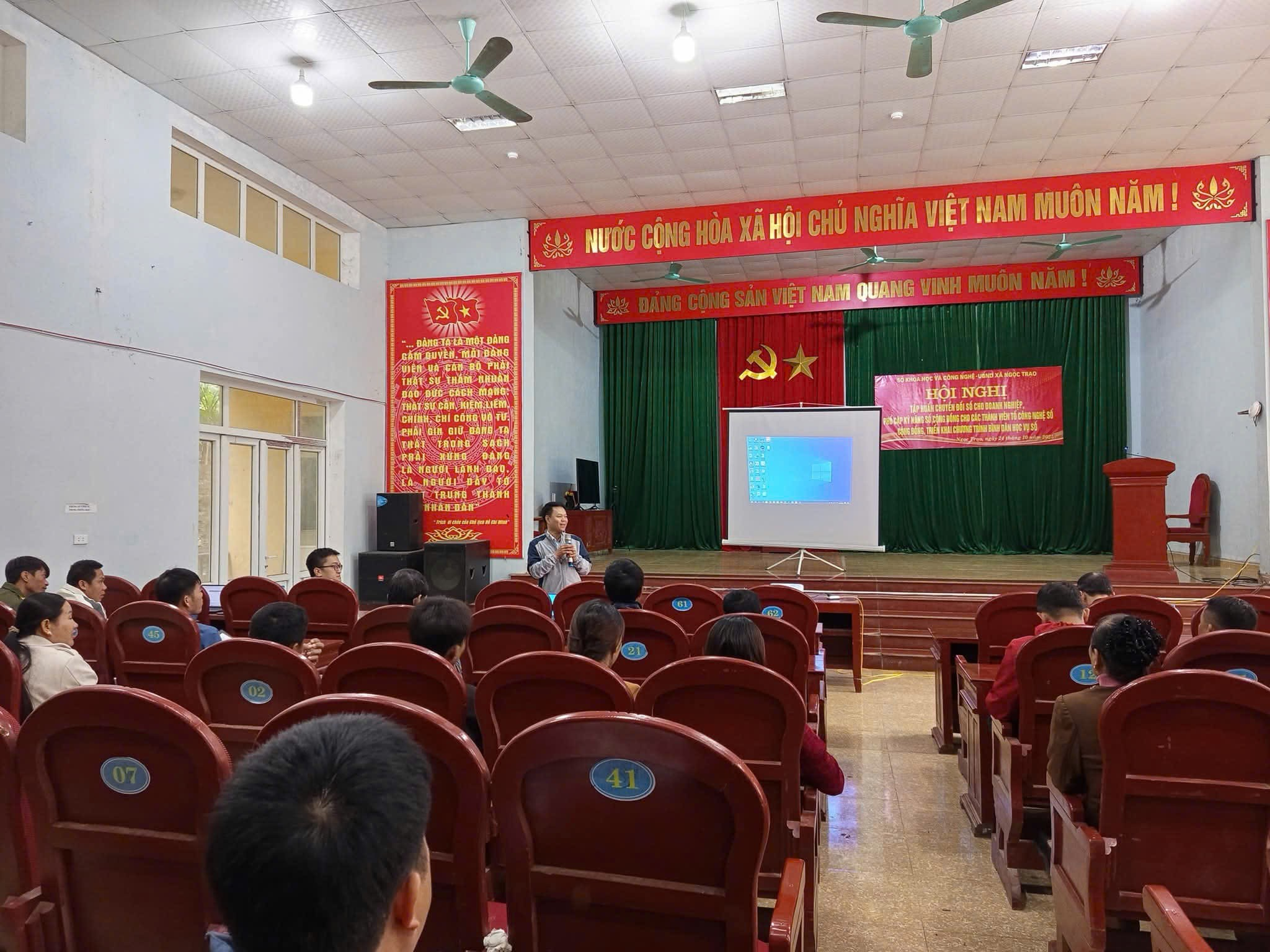 Thực hiện kế hoạch số 72/KH - UBND ngày 17/10/2025 của UBND xã Ngọc Trạo về tổ chức tập huấn về công tác chuyển đổi số trên địa bàn xã Ngọc Trạo năm 2025. Ngày 24/10/2025, tại hội trường UBND xã, UBND xã phối hợp với Sở Khoa học và Công nghệ tỉnh Thanh Hóa, tổ chức hội nghị tập huấn về Chuyển đổi số trong doanh nghiệp, kỹ năng nghiệp vụ hoạt động của Tổ công nghệ số cộng đồng. Nâng cao nhận thức, kỹ năng chuyển đổi số và phong trào bình dân học vụ số cho các Doanh nghiệp và các thành viên tổ công nghệ số cộng đồng trên địa bàn xã.