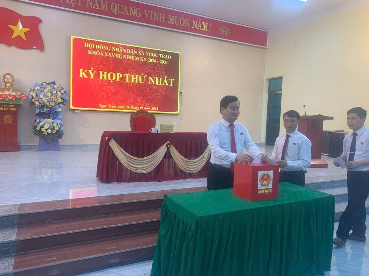 Các ông bà đại biểu HĐND xã Ngọc Trạo khóa XXVIII nhiệm kỳ 2026-2031 bỏ phiếu bầu các chức danh chủ chốt của HĐND-UBND xã tại kỳ họp