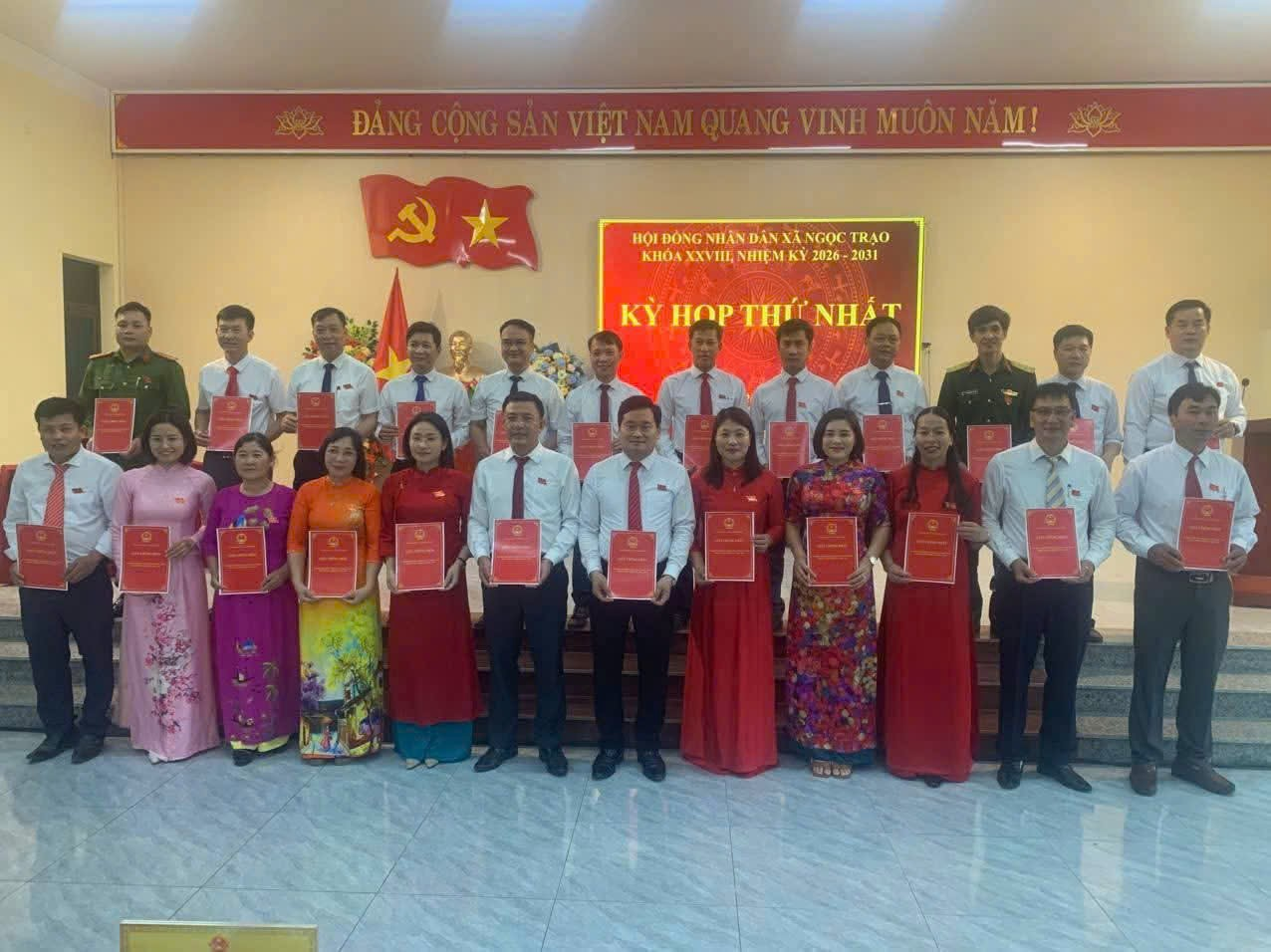 Các đại biểu nhận giấy chứng nhận Đại biểu HĐND xã Ngọc Trạo khóa XXVIII nhiệm kỳ 2026-2031
